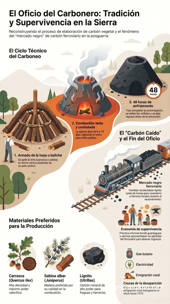 No obstante, la dependencia de este suministro informal era estacional e irregular. Cuando el lignito «caído» escaseaba o la demanda en la fragua de Casas de Garcimolina aumentaba (por ejemplo, durante la época de siega para afilar hoces y guadañas), los herreros recurrían al circuito tradicional del carbón vegetal.