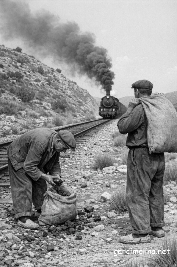 Contexto de escasez, surgió una práctica informal que benefició directamente a los herreros de Casas de Garcimolina y otras localidades cercanas. Las líneas de vía ancha del Central de Aragón, las locomotoras de vapor, consumían grandes cantidades de lignito. En tramos con fuertes pendientes (como Ragudo o Escandón), el carbón se desprendía de los ténderes por vibración o mala compactación y caía a lo largo de la vía. Vecinos de casillas, pueblos próximos y trabajadores ferroviarios recogían ese carbón caído, considerado un recurso «libre», aunque RENFE lo contabilizara como pérdida.