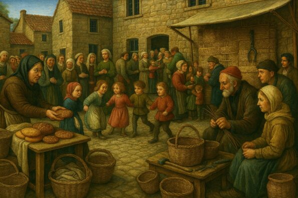 Desde un tendal de estopa o puesto de venta ambulante y sobre una tabla de madera, dispuesta entre cestos de mimbre y paños de lino; se ofrecían, tortas de miel y nueces, alajú envuelto en ojos secas, pan de higos, almendras tostadas, caramelos de resina y otros frutos secos. La vendedora que medía con la vista, pesaba con la mano, y cobraba con la palabra. Dueña, que vestía saya de lana basta, con el delantal manchado de harina y resina, y un pañuelo oscuro que recogía su cabello con nudos sencillos. No regateaba, pero sí canjeaba, por lana hilada, por cucharas de boj, por noticias del valle. Sabía quién había parido, quién había muerto, y quién aún debía una torta del año pasado. Puesto no solo de dulces, era de memoria, fuente de información, trueque, y respeto. Observaba, analítica y atentamente.