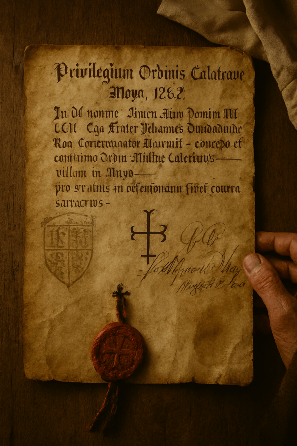 Dentro había un pergamino sellado, la prueba de que Moya había favorecido a la orden de Calatrava, desde 1245 hasta la actualidad, cuando don Juan González fue gran maestre de Calatrava y señor de Moya. Junto al pergamino, había robado también un escudo heráldico de piedra, perteneciente a algún gran señor, y que doña Ximena había dicho que lo tenían “ahí detrás en la cuadra”. Medio escondido porque pesaba mucho y no sabían qué represalias podría acarrearles, por unos y por otros seguidores de las órdenes.