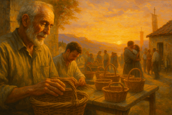 La comunidad, fortalecida por este legado, acogía a cada viajero reconociendo el valor de su historia. Las risas del taller resonaban como cantos de esperanza, mientras tradiciones antiguas y modernas se fundían en un puente temporal. Este vínculo permitía que el espíritu de Herminio perviva en cada movimiento de las manos de Mateo, en cada cesto creado y en cada historia incorporada al gran tejido de la memoria colectiva. Habían erigido no solo un taller, sino un santuario donde lo eterno se construye con paciencia, amor y la flexible resistencia del mimbre.