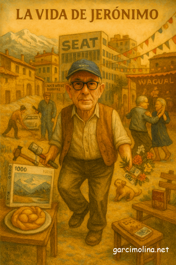 Jerónimo recuerda una vida sencilla, vinculada a las tradiciones rurales: el hornazo que le regalaba su madrina, las ilusionadas noches de Reyes, los inviernos nevados y el trueque como forma de vida. A los 16 años emigró a Barcelona, como muchos otros jóvenes de la época, en busca de oportunidades. Allí trabajó como calderero industrial en INDESME y luego en SEAT, donde permaneció 35 años hasta su jubilación.