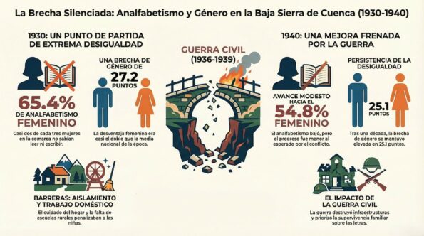 Este artículo se acerca a la realidad de Casas de Garcimolina, pequeña localidad de la Baja Serranía de Cuenca, para comprender cómo la desigualdad de género marcó las tasas de analfabetismo en los años posteriores a la Guerra Civil. No se trata de un estudio estadístico exhaustivo, sino de una reflexión basada en fuentes primarias y en la comparación con los datos conocidos de la comarca, con el objetivo de recuperar la memoria de aquellas mujeres a quienes se les negó la posibilidad de aprender.
