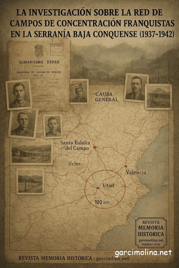 La investigación sobre la represión franquista en la Serranía de Cuenca requiere un conocimiento preciso de la geografía carcelaria y del aparato represivo que rodeaba a sus pequeños núcleos rurales. Este estudio identifica y documenta los principales campos de concentración situados en un radio de aproximadamente 100 kilómetros de localidades como Casas de Garcimolina y Algarra, abarcando el sureste de la provincia de Cuenca, el este de la provincia de Teruel y el oeste de la provincia de Valencia.