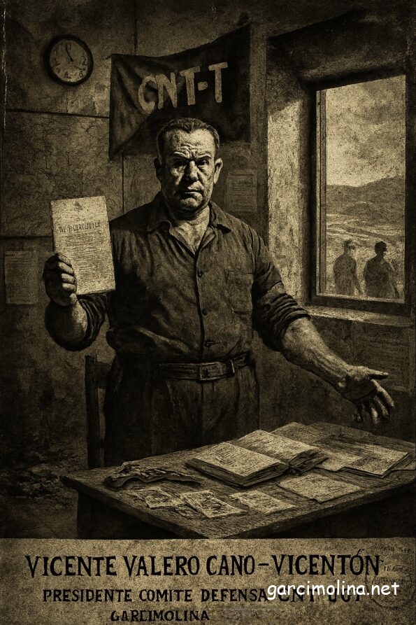 Conocido por el sobrenombre de «Vicentón» (presencia física, imponente y un carácter temido y respetado), era el presidente del Comité de Defensa y de la Colectividad de la CNT y UGT en Garcimolina. El expediente lo pinta como el principal ideólogo y ejecutor de la transformación revolucionaria en el pueblo.