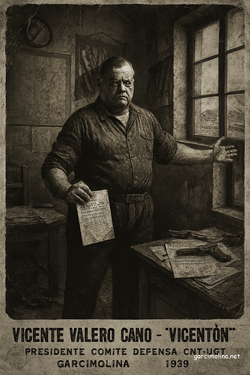 Conocido por el sobrenombre de «Vicentón» (presencia física, imponente y un carácter temido y respetado), era el presidente del Comité de Defensa y de la Colectividad de la CNT y UGT en Garcimolina.