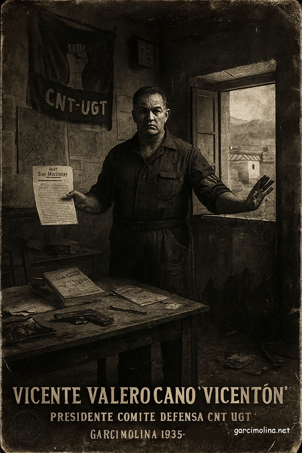 Conocido por el sobrenombre de «Vicentón» (presencia física, imponente y un carácter temido y respetado), era el presidente del Comité de Defensa y de la Colectividad de la CNT y UGT en Garcimolina.